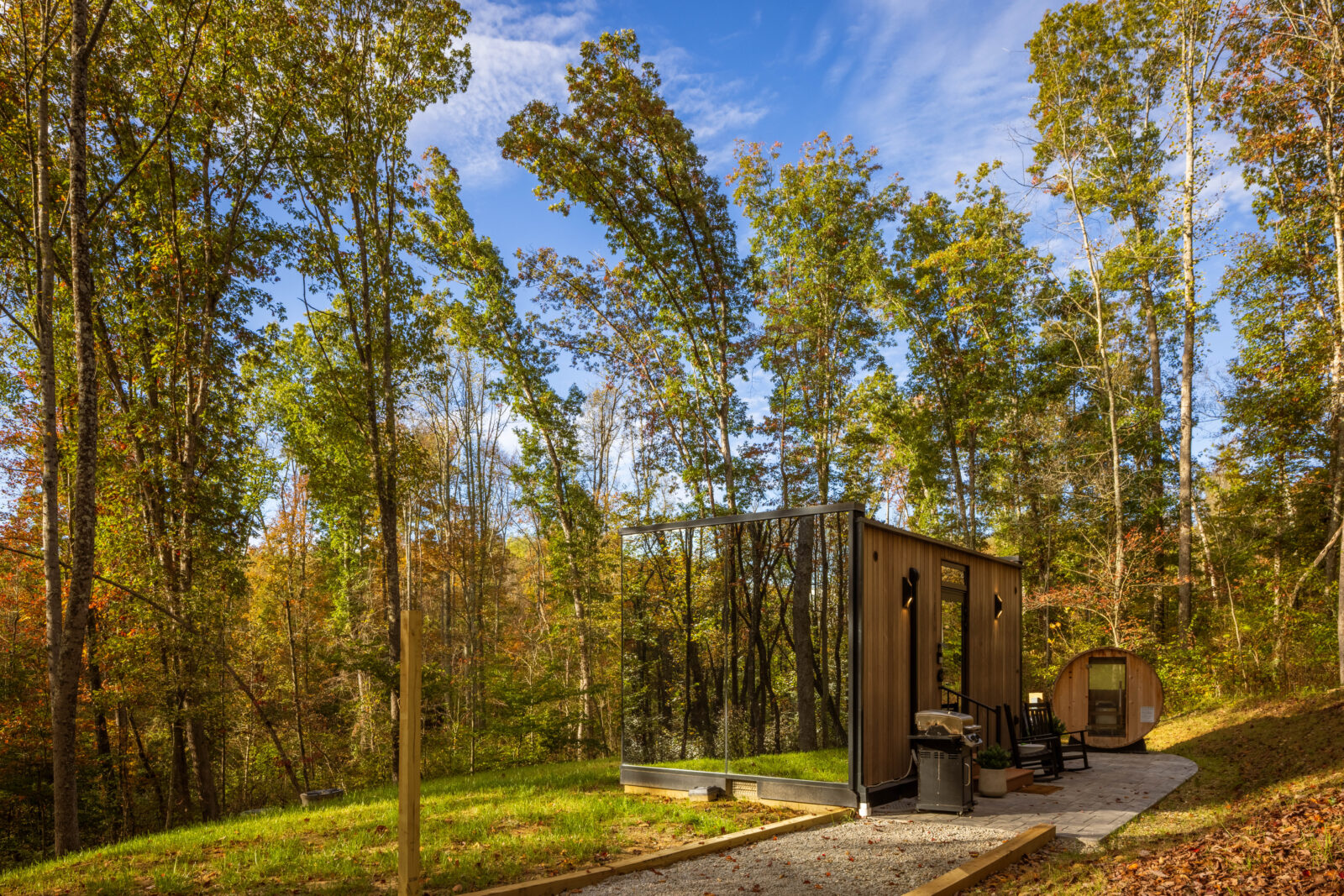 Reserve space for something special. Introducing Fauna, our romantic mirrored cabin nestled in the heart of Hocking Hills. Escape in Ohio and reconnect with nature and one another at this unforgettable immersive getaway. It’s secluded setting allows time to slow down and guests to refocus on what’s important. Features include: