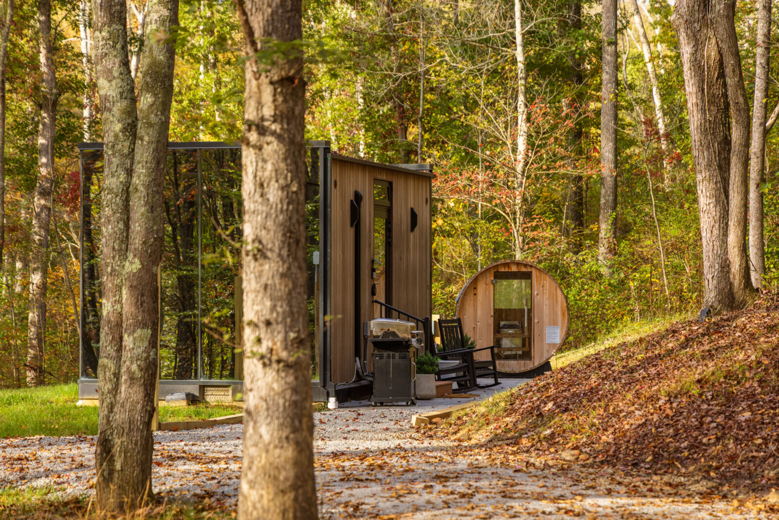 COMFORT: Fauna sits atop a small bluff overlooking the trees of Hocking Hills and seamlessly blends the indoors with the outdoors, which can be enjoyed from the comfort of your bed. Sleeping two guests, the mirror cabin has luxurious interior finishes with the intention of rest, relaxation, and reconnection. Relax in your private hot tub and sauna and see the surrounding flora and fauna magnified by your dwelling. Gather around the fire pit and take in the changing seasons, which are abundant in Hocking Hills.